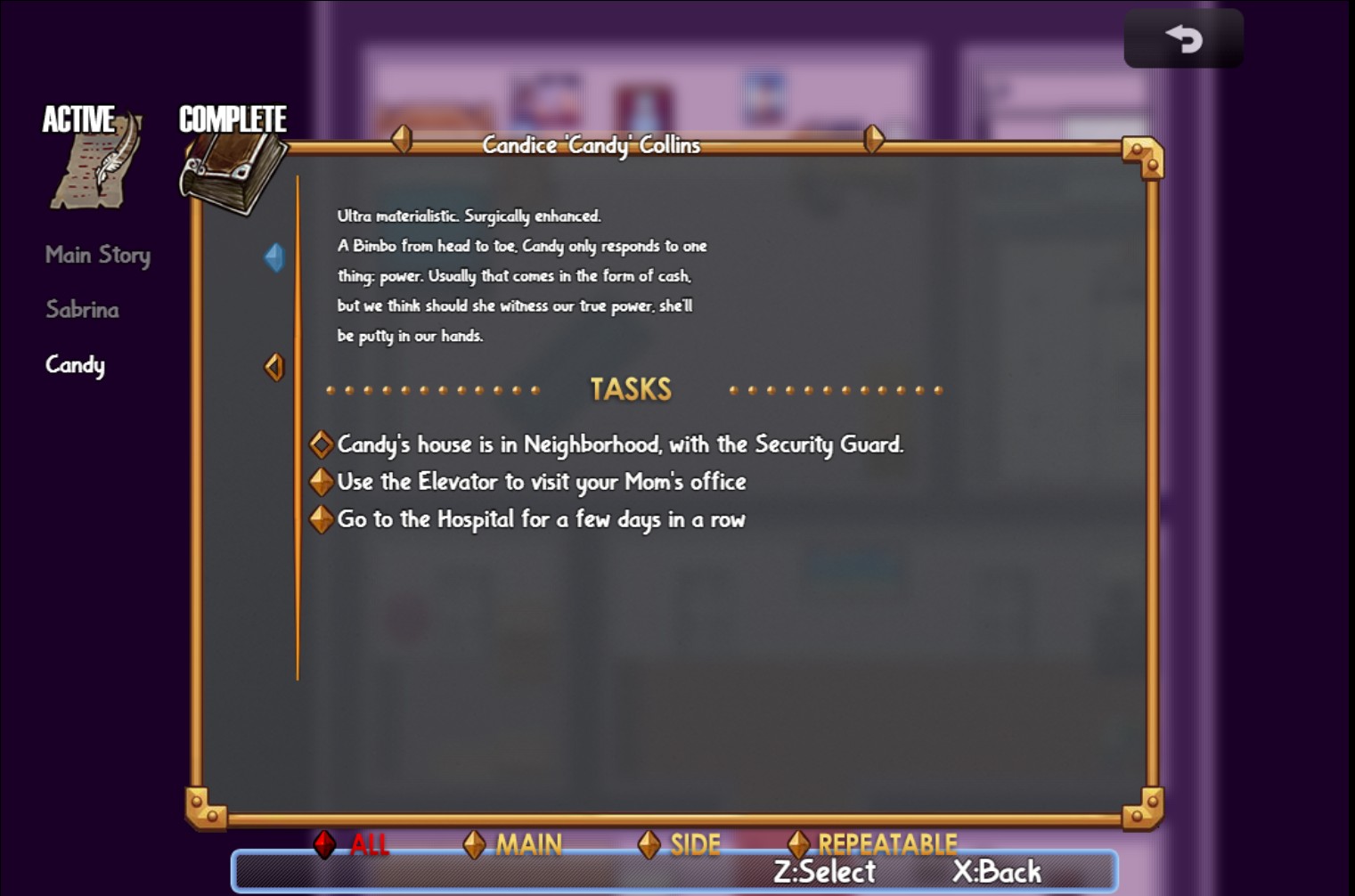 I did find Candy's house and I was able to run through her quests, that just leaves me with Sabrina. The only quest I have at this point is Return to Sabrina at Hex-Rated, but she is in her room and I cannot talk to or get to her. I don't see a way of continuing on with Leslie or Ashley. Am I missing a step somewhere?