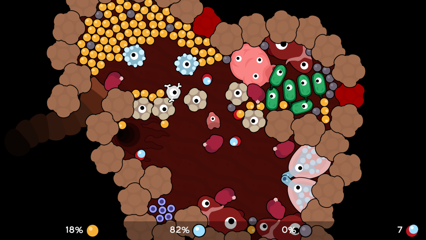 2 день: пришла идея сделать игру про организм, в котором игрок выполнял бы роль автономной нервной системы. Нарисовал первые органы и клетки, в этот раз стиль игры мне понравился. Сделал управление, первые органы, клетки и кровь. Игра выглядела сыроватой, всё ещё было сложно сказать каким получится итоговый продукт.