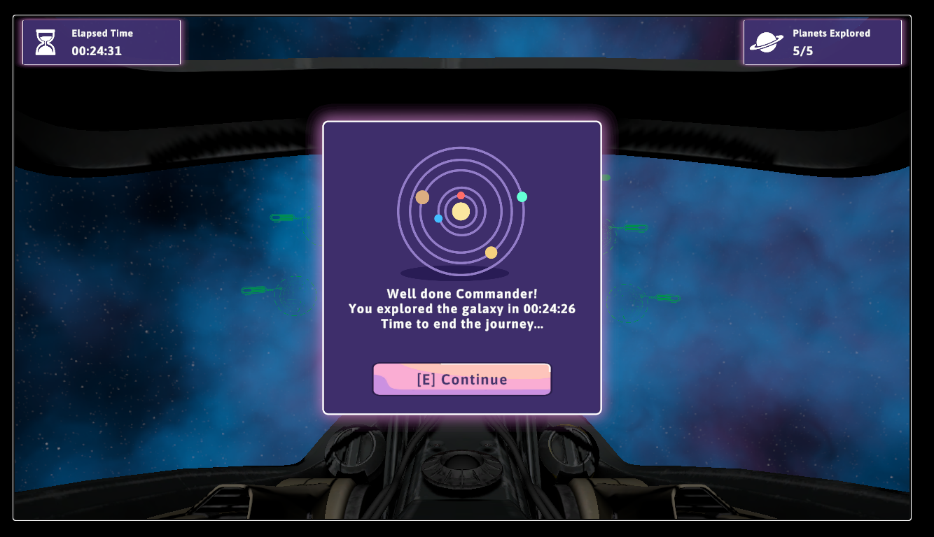 This had some No Man Sky vibes to it. I like that you had clear objectives (that were marked off as you finish each one) The sparkles were a nice touch to help draw you to quest areas, super smart design choice! Some kind of indicator that helped point you to your ship would help with navigation, there were times I was trying to explore new areas of the planets and would accidentally circle around to the same areas. Some kind of compass or extra navigation feature would help tremendously with that. I'm impressed with how many planets and biomes you managed to include, the game felt pretty polished as a whole! Really feels like a demo for a bigger game/idea. Great job to the whole team for getting this done in a week!