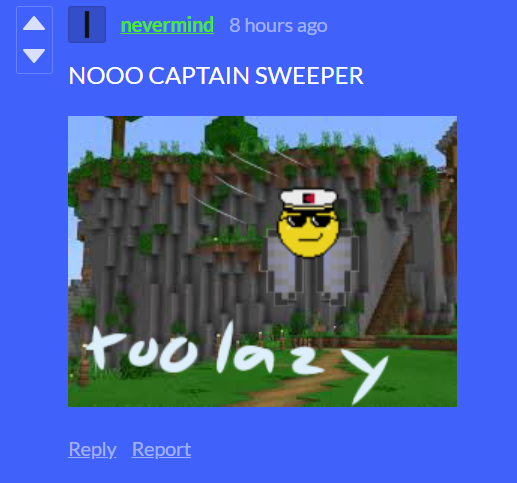 Captain Sweeper is actually 13, but the stress ages him, so the bosses try to scare him out of it, but he sees them as a threat, and he tries to kill them, so they fight back. 9 does a good job at this because a literal non-existent minesweeper number, which is an atomic bomb, appeared right in Captain Sweeper's face. But 10 thinks that REPEATEDLY SLAPPING CAPTAIN IN THE FACE would work. Oh no, it did not. Instead, he became a psycho and wanted to kill 10 even more. 10 tries to scare him with a countdown, but that's like Coughing Baby VS Hydrogen Bomb. Captain Sweeper "wins" and regains his self-control.