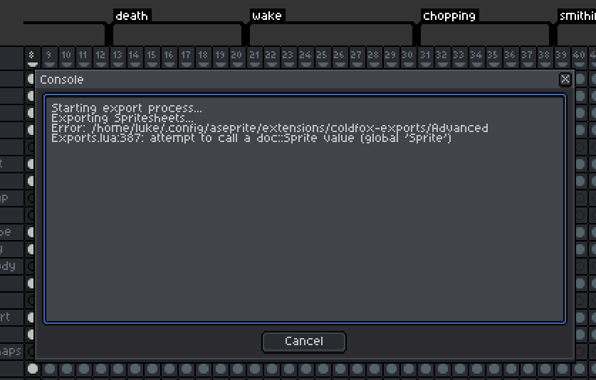 Aseprite Advanced Exports community · Created a new topic Error when exporting "attempt to call a doc::Sprite value (global 'Sprite')