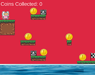 Jump onto platforms, collect coins, and don't collide with spikes and water!