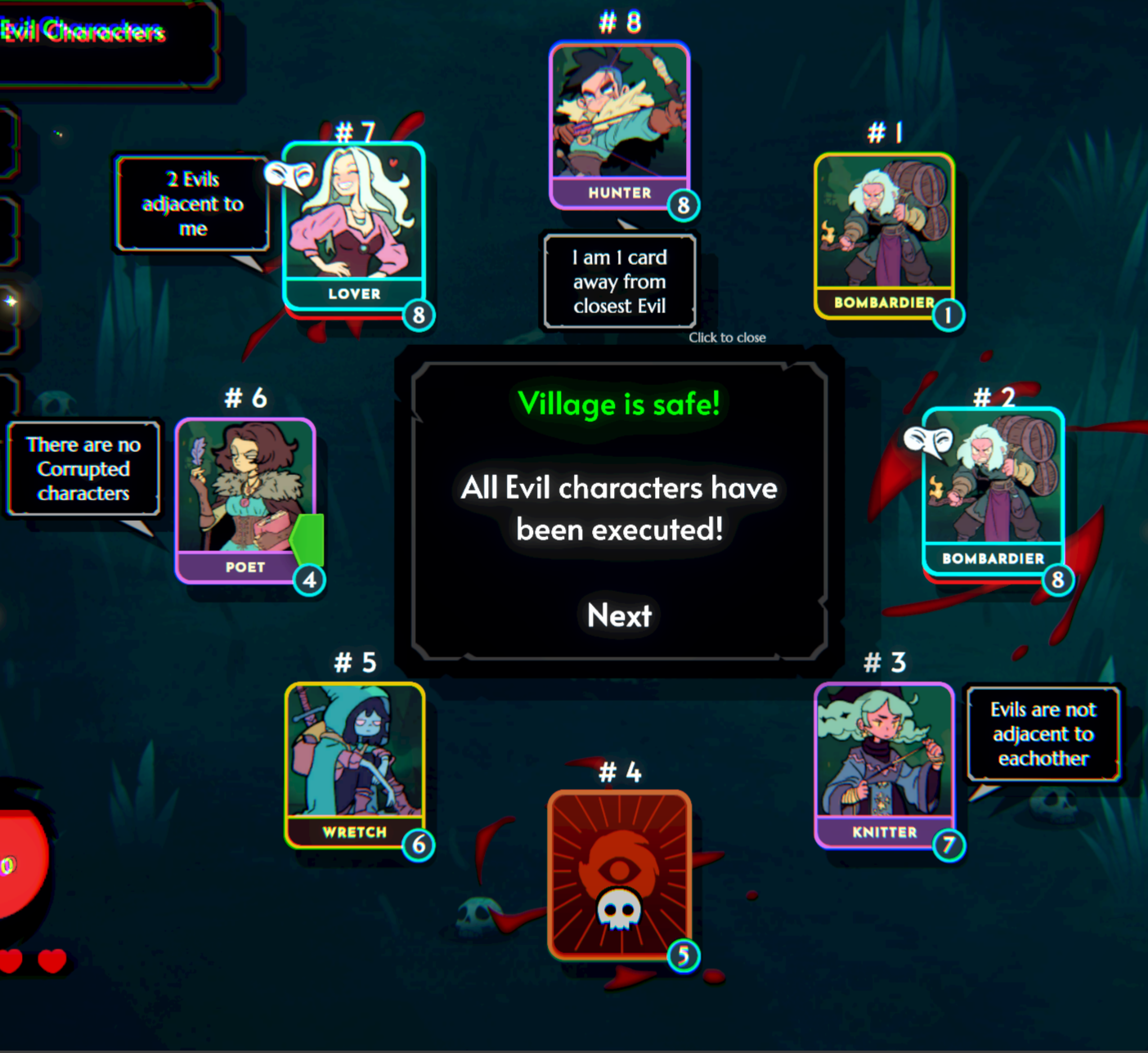 Evil Hover text. The Evil hover text has a few grammatical oddities. Maybe change it to “Character alignment. Eliminate all Evils to save the village. Evils Lie and Disguise, unless specific rules say otherwise.”