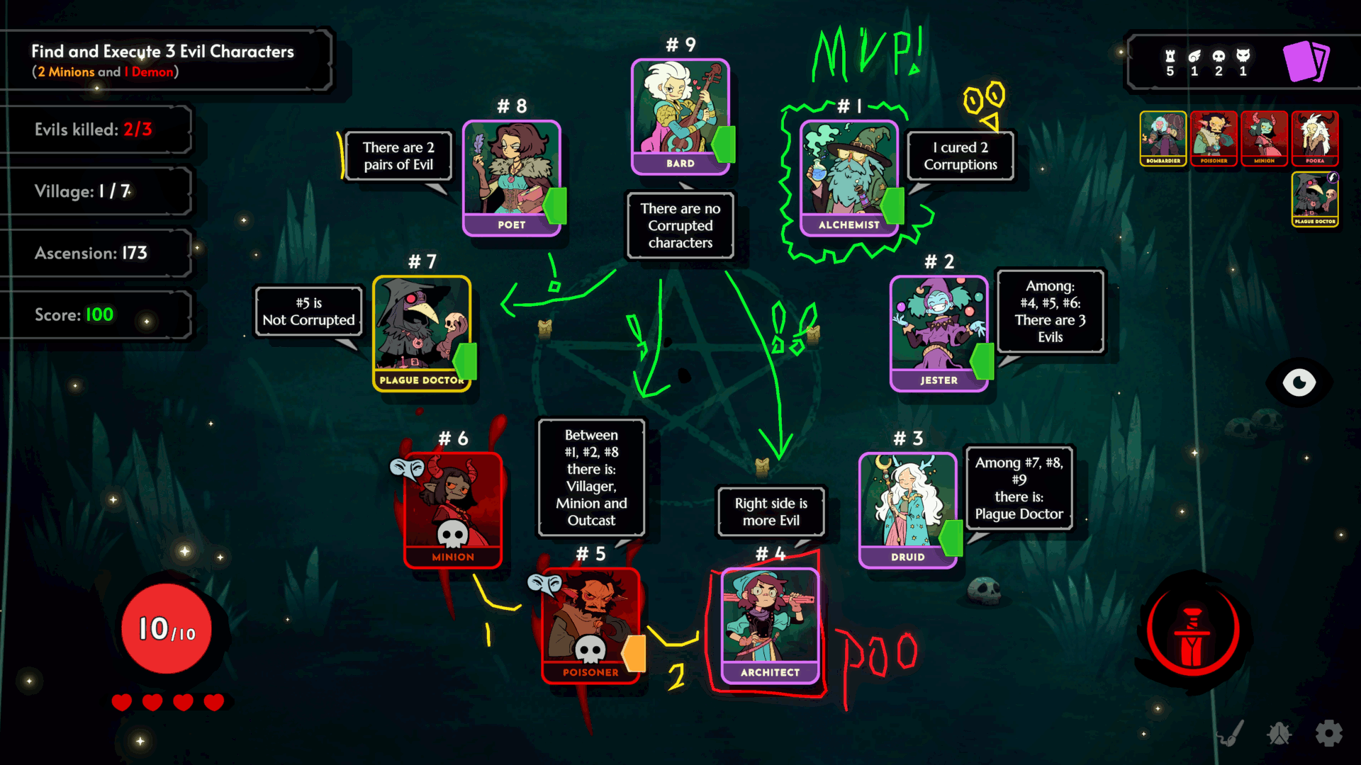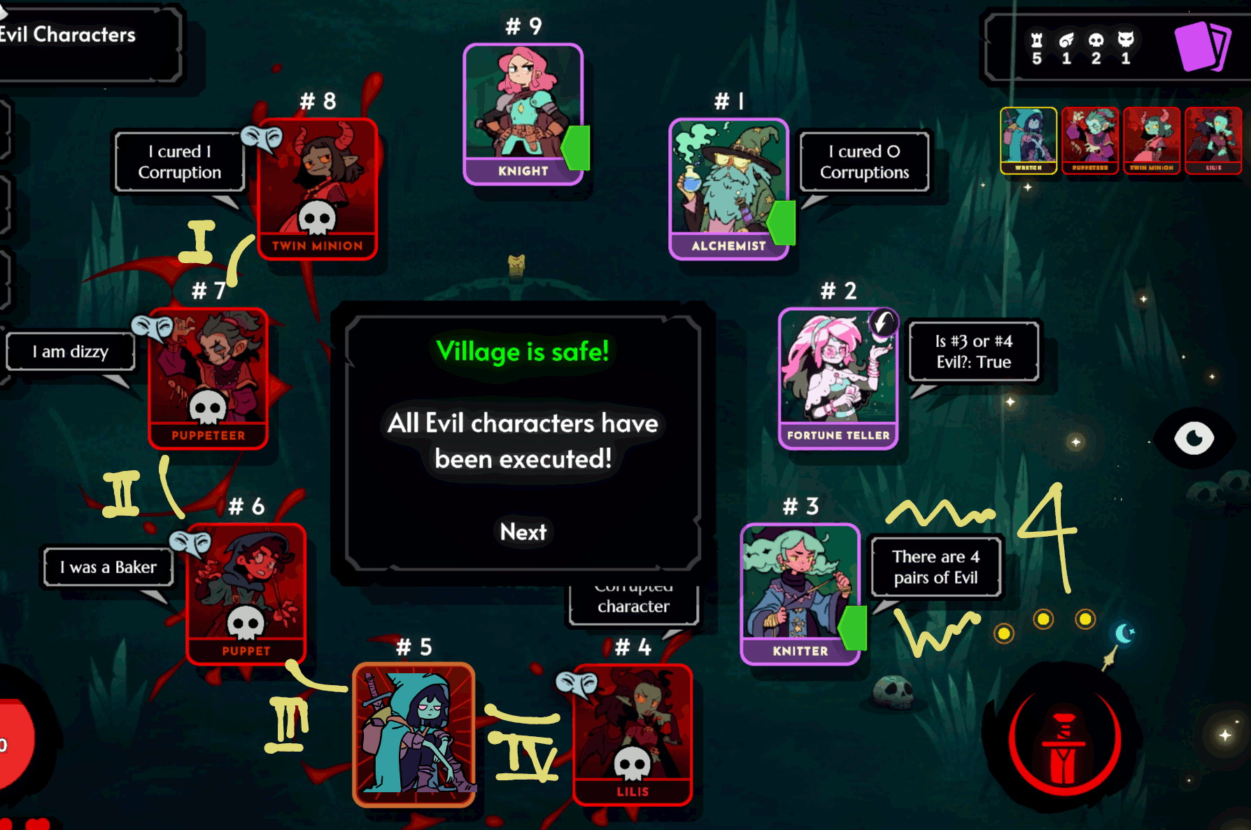 But also because Puppet and Puppeteer are a two card pair in a four villager line (#9, #1, #2, #3), if you have >5 health, you are guaranteed to get one of them and have health remaining by stabbing the middle two villagers, #1 and #2! Then you get the other one!