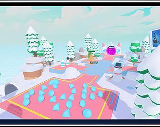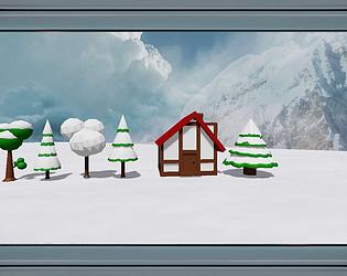 Charming low-poly snowy Christmas village map. Festive, cozy winter wonderland village environment.