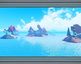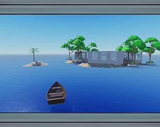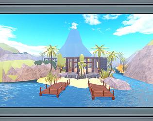 A stylized floating island port with a pirate-themed house, trading dock.
