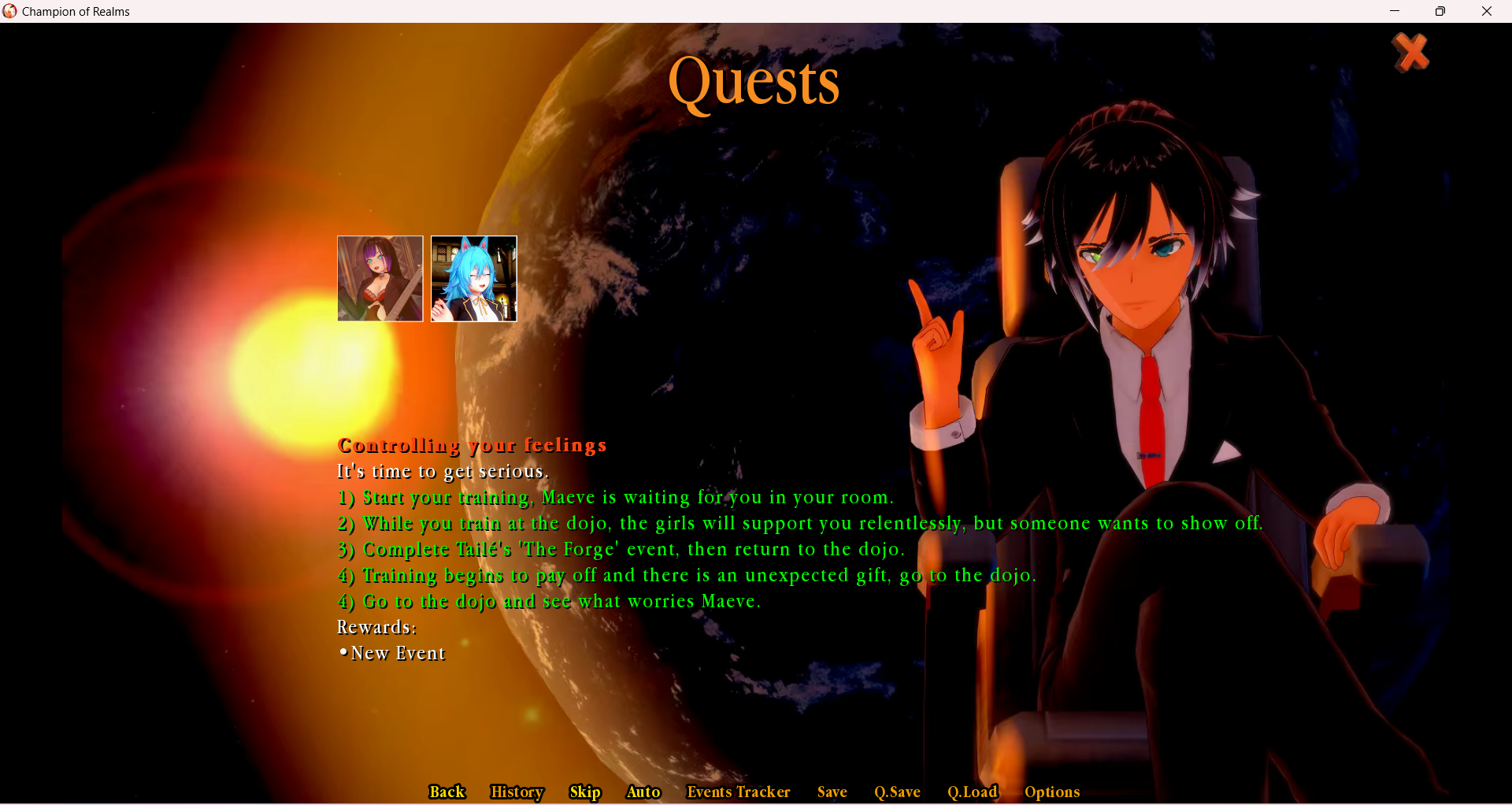 I did what I saw someone else say worked, and loaded a save that's not in the bedroom, and it worked and I was able to get into the game. I've done everything on the event tracker apart from Void which I have no idea to how to trigger, but this quest is still showing and saying the reward is a new Event. Oh and I haven't unlocked the new main girl, if she's in-game. She' still a chained black square