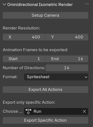 This free Blender Addon automates the process to render a character or game asset in an isometric view from multiple directions. You get an extra side panel in which you can specify all the necessary options. Export to single images or directly into a full spritesheet.