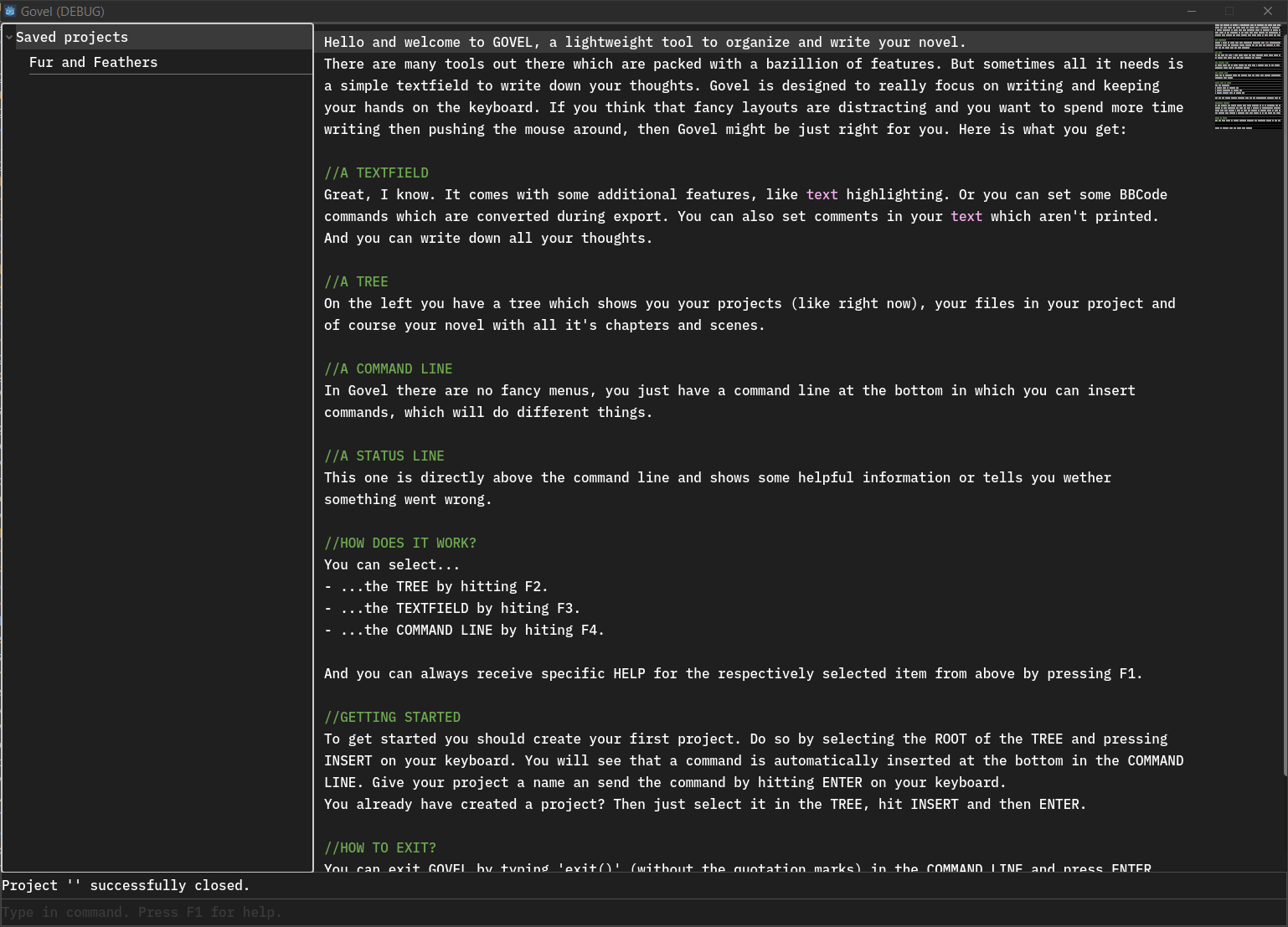 Govel is a lightweight novel writing and organizing software designed with the intention to leave your hands where they belong: on the keyboard.