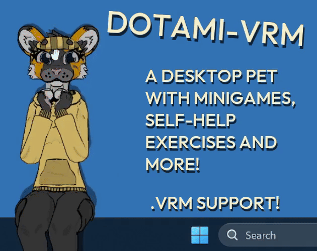 Dotami-vrm is a desktop buddy/pet game with support for uploading your own .vrm avatars (vtuber standard), with a focus on cute interactions, self care exercises and minigames! There is also an outfit and coloring system, paint characters and outfits using an RGB wheel!