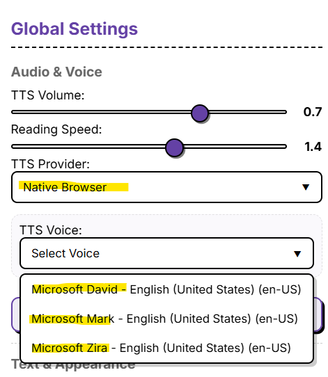 If you go in global settings, you will be able to choose your TTS provider, and if you pick Native browser you will get the microsoft voices
