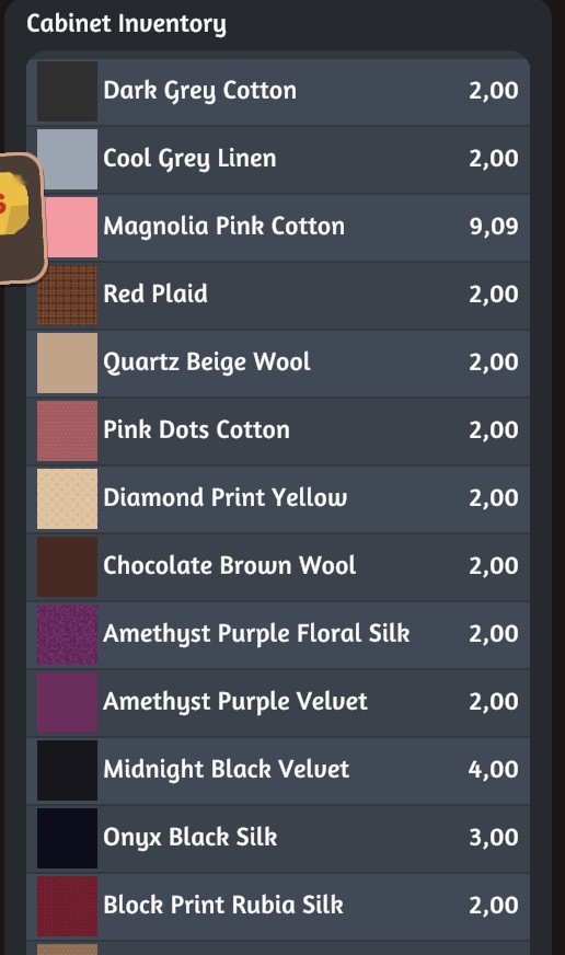 My only suggestion is to add a scroll bar to the fabric section you already have in the cabinet inventory and to the accessories section in the create-a-dress mode, since in both instances it allows me to scroll and see the entire content once I've purchased a certain number of items.