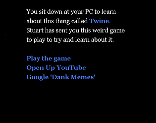 A micro-RPG made for Twiny Jam, where you needed to make a Twine game using 300 words or less.