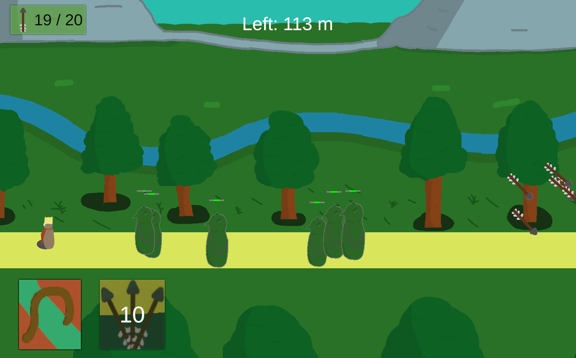 The king found out that they stole his favorite BROOM! Enraged, he ran into the goblins' lair to retrieve his treasure! The king is extremely old and weak to resist even a single blow, so your goal is to prevent the king from dying by destroying the goblins faster than they reach the king!