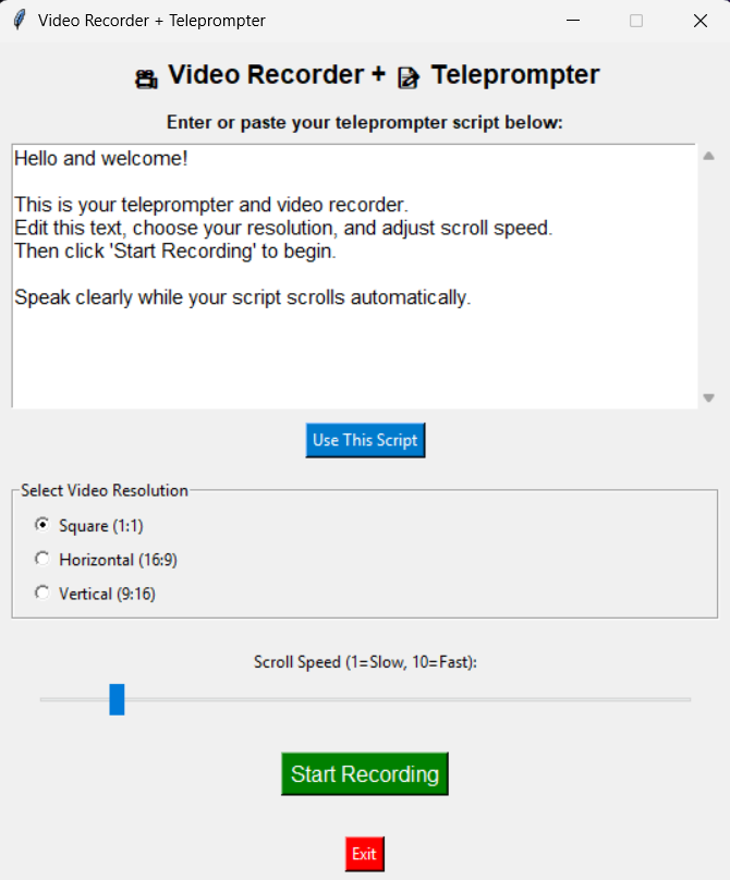 Teleprompter Video Recording with Script Editor, also with Resolution Selector (Square, Horizontal, Vertical) and Workable on Windows, Linux and Mac all three. Python Program.