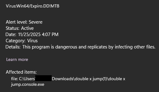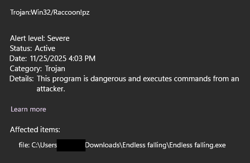 Your game you made for this jam: "Endless Falling" is the one with a trojan named "Raccoon", here is the windows security output. This is a trojan focused on stealing data.