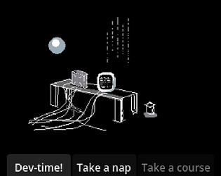 Hahah! I should have implemented a function to bribe judges if you can make tons of money! In order to win you need to level up your project depending on the type (rpg, action or adventure)! Managing the time is as frustrating as in real life which maybe is not the best choice for a game but I am glad you enjoyed! I love that little character doing stuff too! I wonder if I should make it a more complete game in the future!