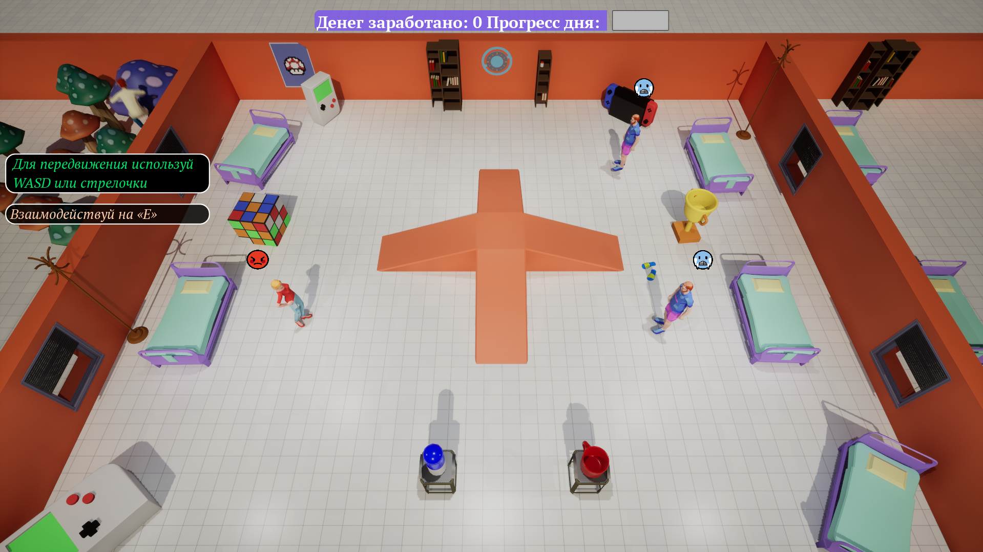 Тут он в целом очень простой и понятный, видишь пациента с болячкой, неси ему соответствующее лекарство, после чего напиши по буквам слово и получишь денег для апгрейда знаний о болезнях. Насколько я понял, чем быстрее написать слово, тем больше денег получишь, но при этом сам диапазон не особо большой, т.е. условно прошёл за секунду получил где-то 8, прошёл за 2, получил 7 и т.д. В рамках тех больших сумм, которые необходимо собрать, такая разница кажется слишком мелкой, из-за чего у игрока вообще нет мотивации спешить писать слова и напрягаться, т.е. элемент реакции пропадает. Если не планируете забрасывать игру, то на это точно стоит обратить внимание, игра прям станет сильно динамичной. Можно например добавить какой-нибудь таймер, который с течением времени будет менять цвет, обозначая, что денег становится меньше.