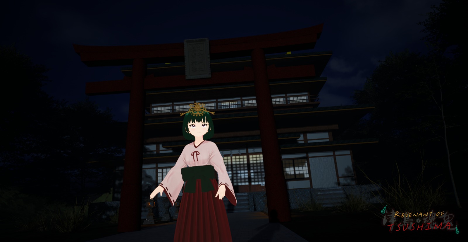This is a night-time shrine area that serves as a quiet starting location rather than a combat space. The goal here is to establish mood: isolation, ritual, and a sense that the place is watching you.