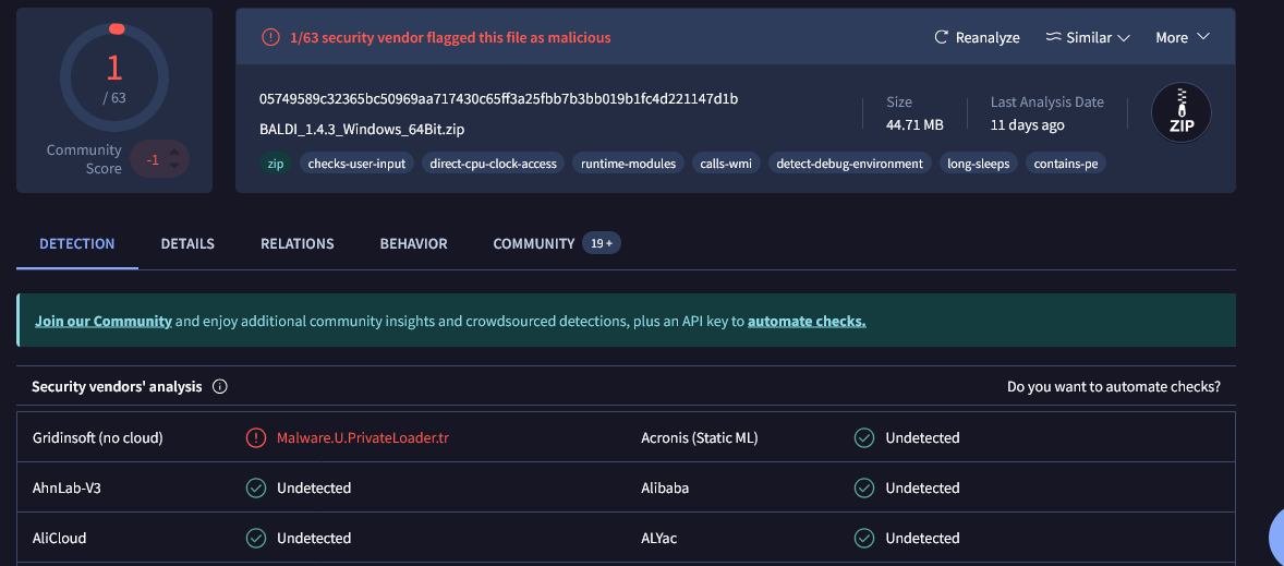 that is called a false positive i'm pretty sure every unity game trips at least one virustotal scanner (image is of the official baldi's basic you can get to prove a point) and actually that specific one is a pretty common false positive if you look it up