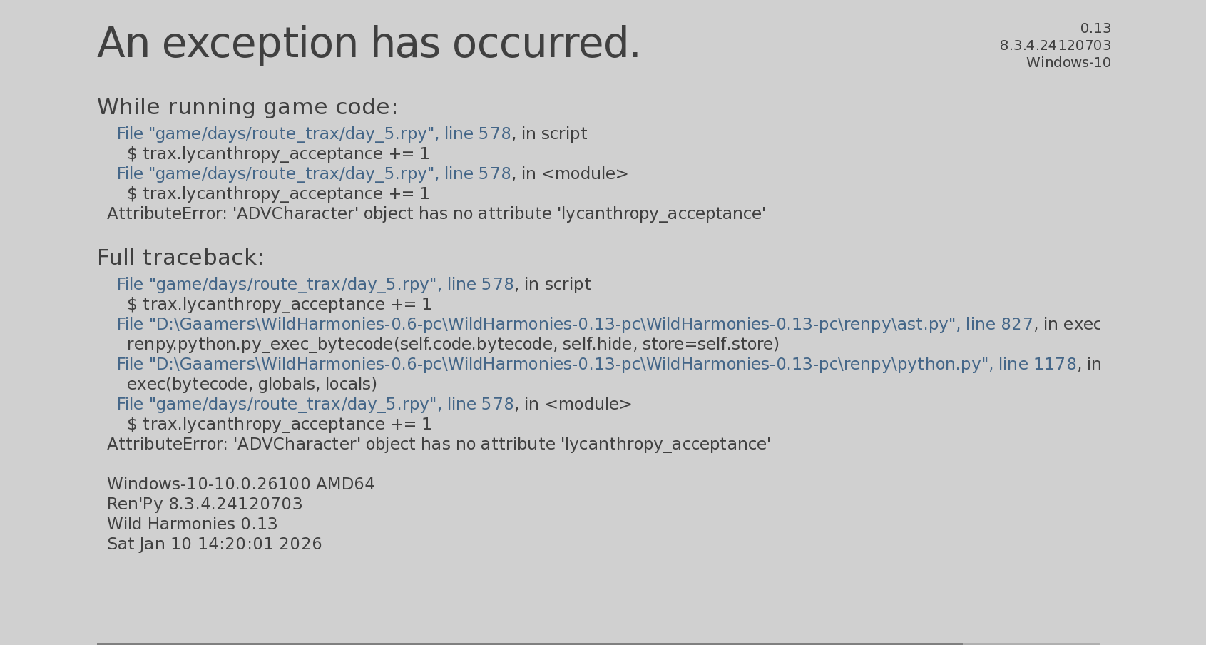Woof, heads up, Trax's lycanthropy acceptance value is never set, or at least isn't set in the choices that I make, so when Nigel shakes himself off at the liquor store I run into a renpy error. Thanks for the vn mate, can't wait to see more!