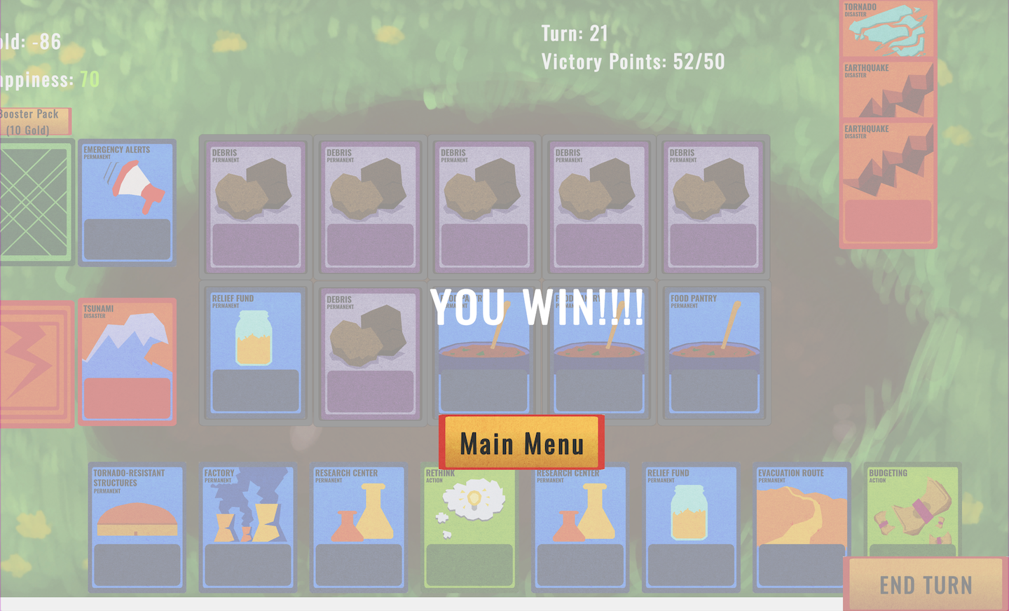 Hi! I really liked the narrative of the game, it was really short and simple but I think it was effective at conveying your point and raising awareness, especially with how you made making a difference in your community make a gameplay difference. I think you have a strong foundation with the mechanics, and I'd personally just like to see you add more to it (I was basically on autopilot after the first minute of the game, and the game only gets easier with the introduction of more shade, so shifting parts of the map or other things that would require me to actively pay attention would be great).