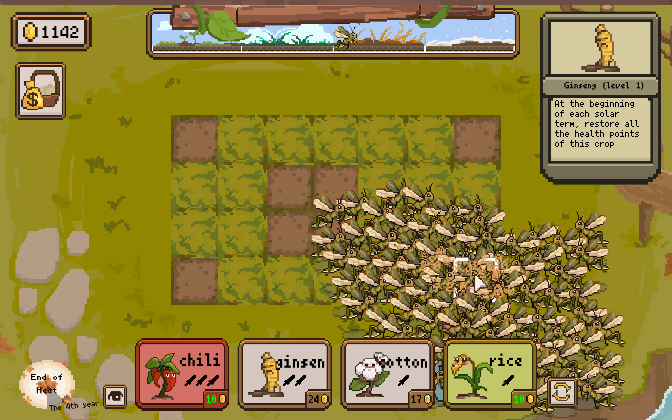 I really liked the art and music! The game is very unforgiving though especially for a new player but once i got the hang of it it was really fun! That bear cat thing at the end of winter is way OP. I did find an exploit with the ginseng troop because he was unkillable! I made it all the way to year 4 with just one ginseng before I stopped. Anyway very good and polished game!