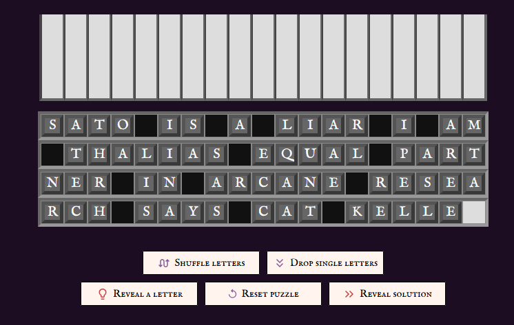 the first letter isn't invisible, the game considers its spot to still be blank. resetting the letter only put the still remaining letters back in the top columns and didn't restore the missing letter, i had to refresh the page and navigate back to the puzzle to solve it