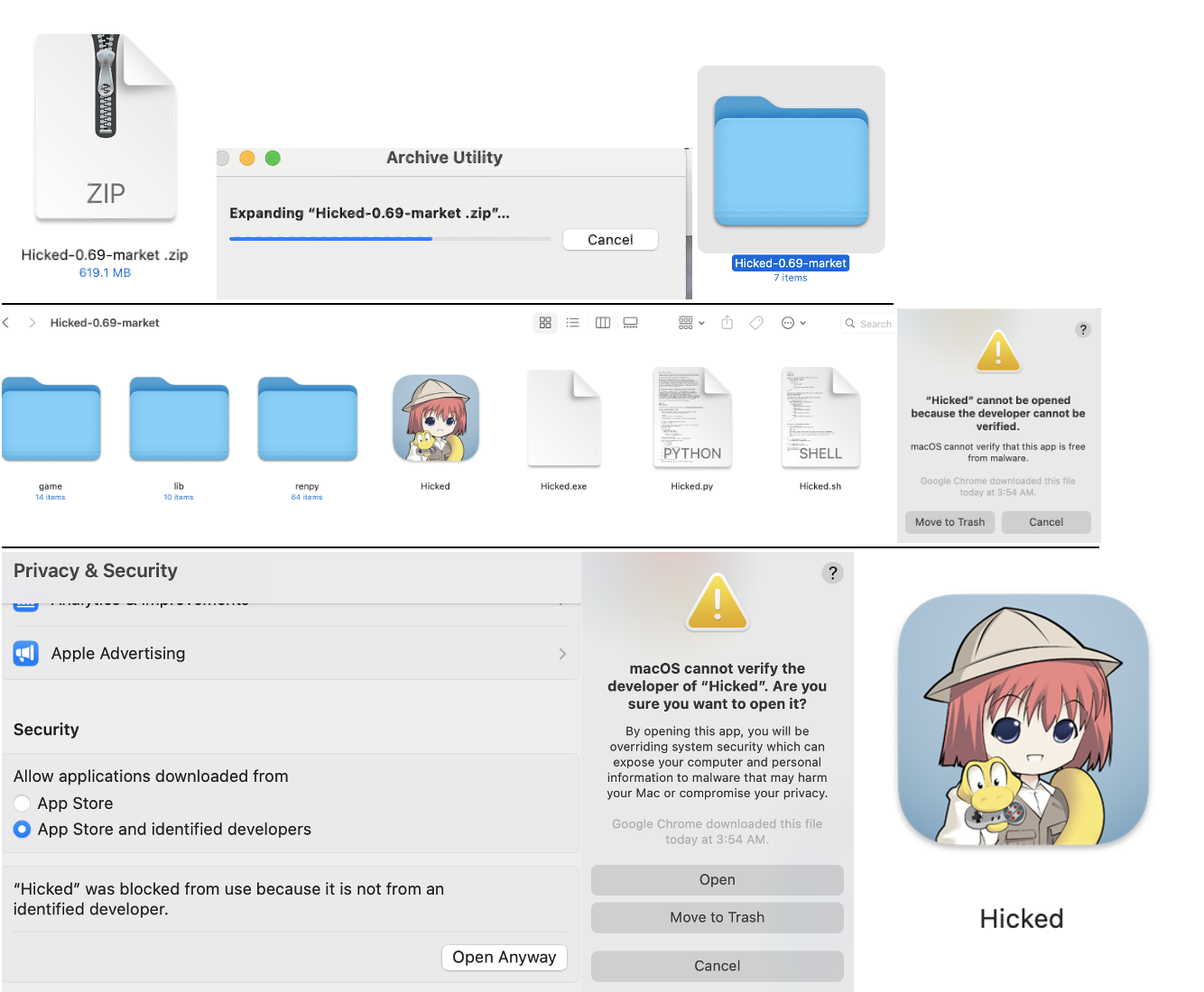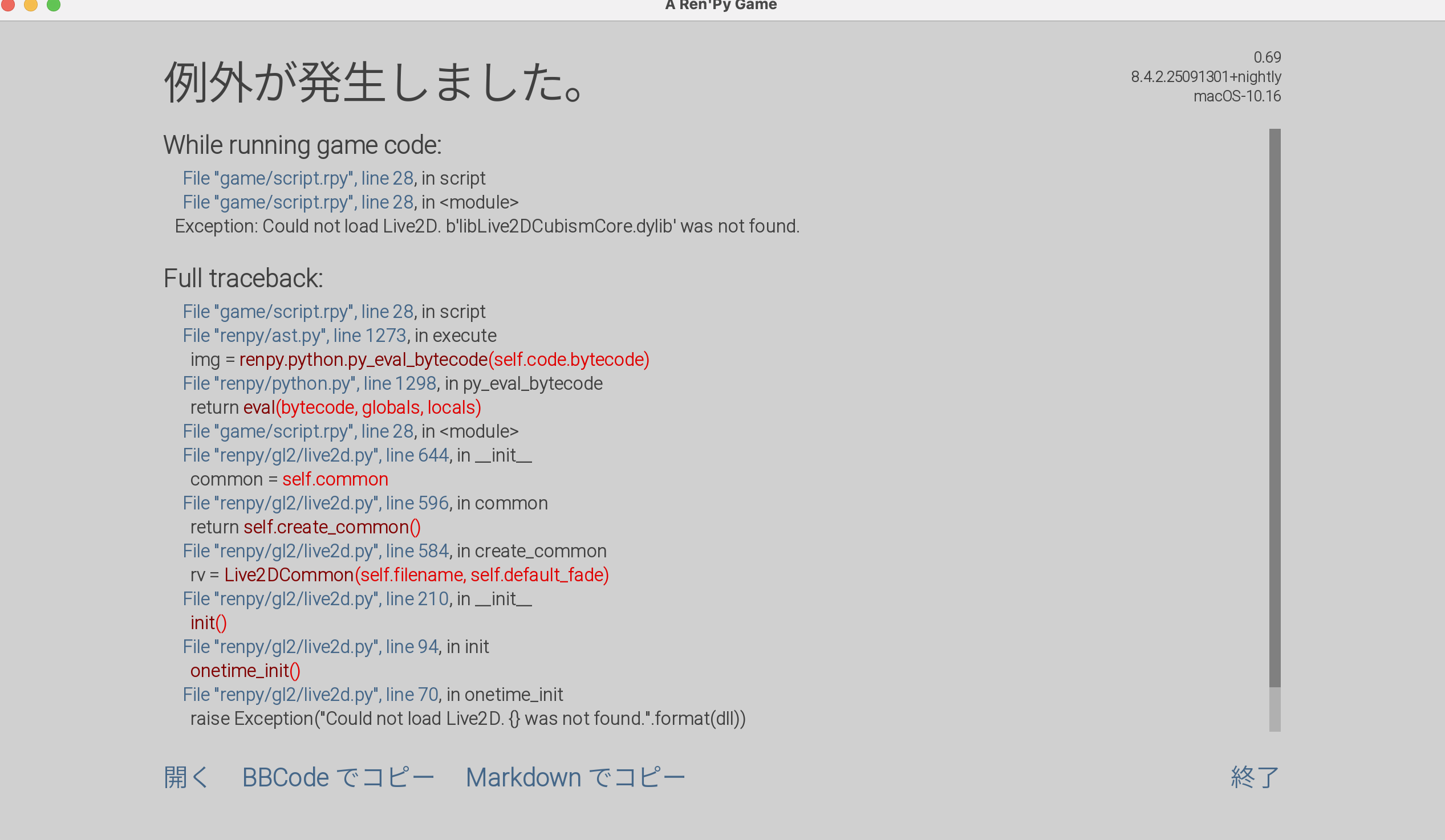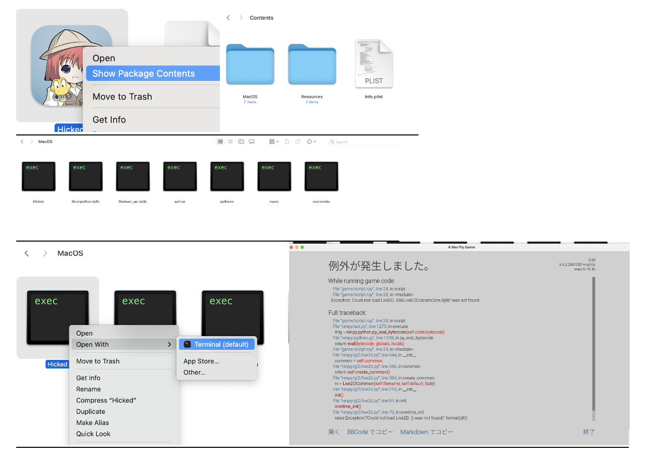 I tried the first solution of copying the "libLive2DCubismCore.dylib" file to Package contents MAC OS folder in the game file, it did not open at all. I tried the mac version, it did open but it's showing this error below.