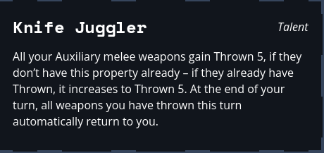 Also, while this isn't a bug, it's more something I noticed with Knife Juggler, is that it says that All Thrown weapons are returned to you, and I have the Nelson Pike, and it wasn't returned to me with the knives. I'm not sure if this is unintended or something you've personally decided to rule, but as written it should also include the Pike since it is a thrown weapon.