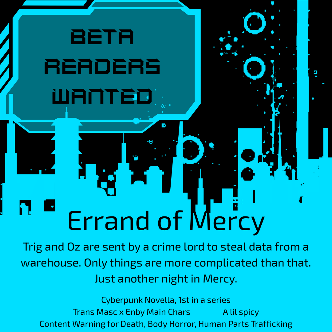 Alt text: B E T A Readers Wanted: Errand of Mercy. Trig and Oz are sent by a crime lord to steal data from a warehouse. Only things are more complicated than that. Just another night in Mercy. Cyberpunk novella. 1st in a series. Trans Masc x Enby Main Chars. A lil spicy. Content Warnings for Death, Body Horror, Human Parts Trafficking. Image has a city scape in neon blue over black and various graffiti style splotches.