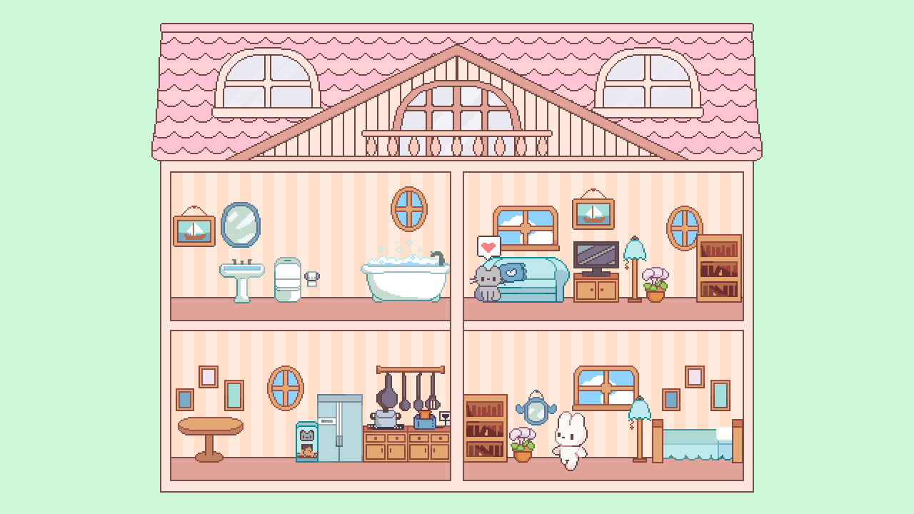 oh my goodness this is a dream. the art is beyond adorable, i love the fact that this isn't purely decorative but includes a minigame & the ability to walk around. big fan of the furniture being on some sort of line/grid, that helps a lot to keep everything nice and even. so much fun, i can't wait to see how this game evolves!