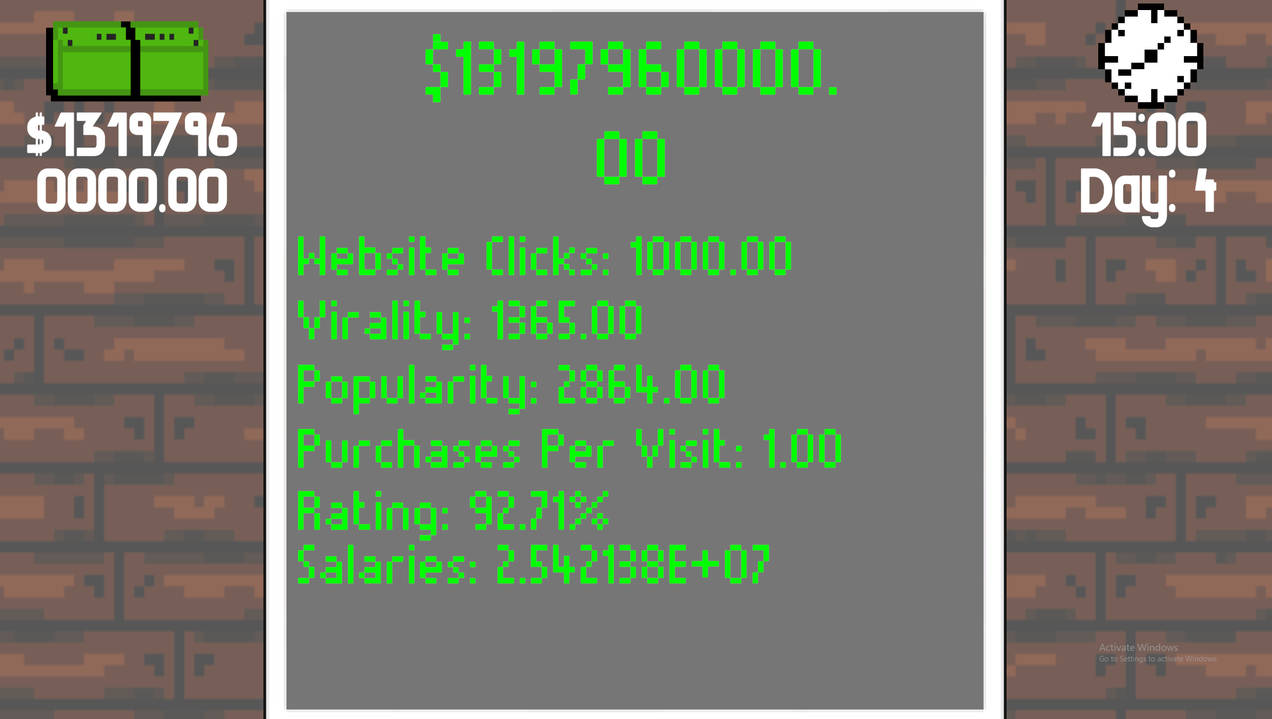 Great addiction simulator. I did not figure out how the puzzle worked in the end and why the music was getting so tense, I thought it would have some certain event after becoming a billionaire, but I waited quite some time and nothing happened. It was a bit creepy honestly. I liked playing the game, keep up the good work!