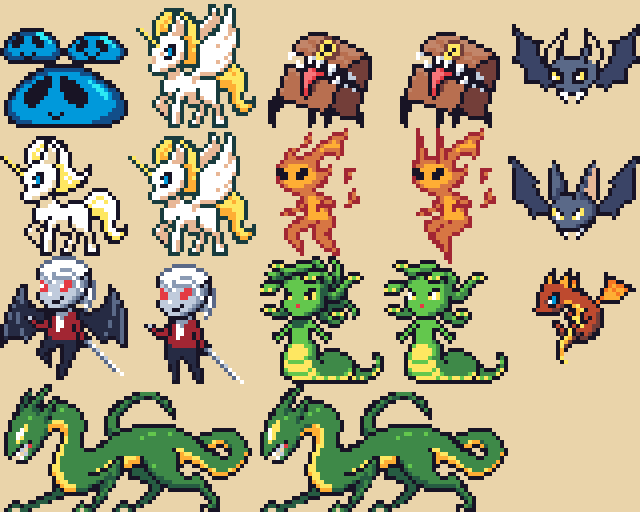As you can see with the ifrit and slime above, I'm planning a variety of animations for each monster. Sprites are 32x32 (or multiples of this for bigger mobs) but that doesn't account for animations, and they're all in indexed color mode for easy palette switching.