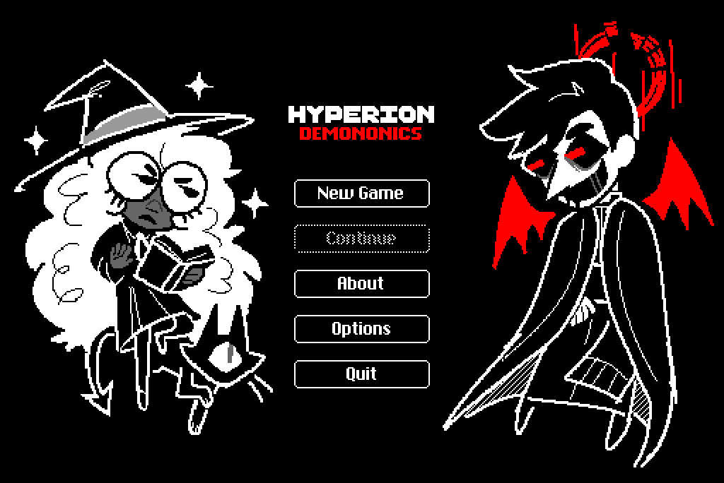 hehehe thank you!! the about and option buttons go to an about and option screen too hehe. you can mess with the text speed of the dialogizer module, disable text sounds if ya want, and change the color palette! i admit i added that after seeing you post about your pink game jam, and wanted to try adding it in the game >:))