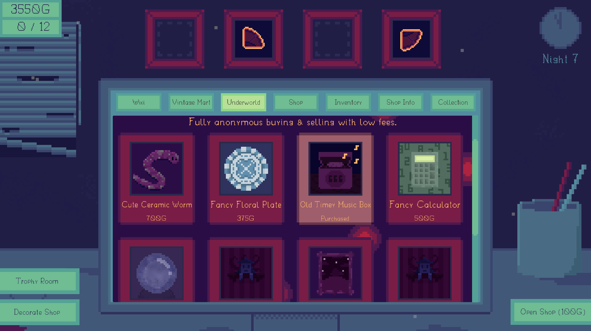 Curio Shop is a cosy horror simulator game where you run a curio shop (shocker). Browse the web by night for stock to sell during the day and watch out for dangerous cursed items that might kill off your customer base. Upgrade your shop and work towards your end goal of total world destruction.