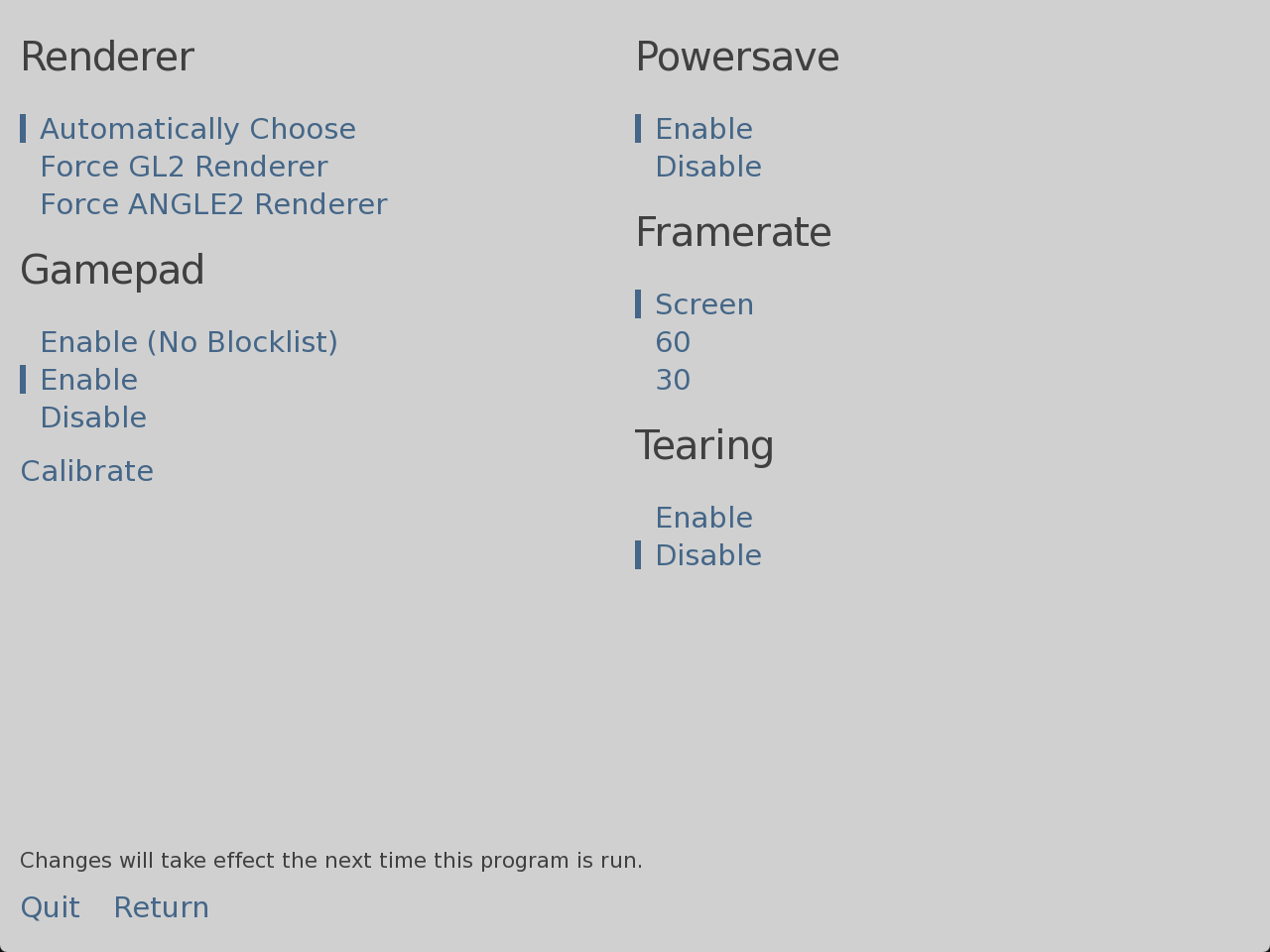 - Under Renderer, try selecting OpenGL (or GL2). Then click "Return" or restart the game.