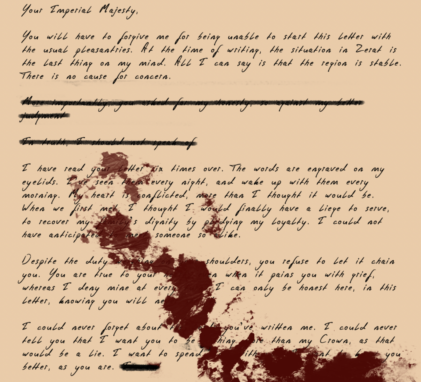 Honestly, it's a great game! The story is very thought out and you can tell how much time and effort went into each chapter. I feel very lucky to of played this as my first interactive novel. I can't wait to see more of your work for the future!
