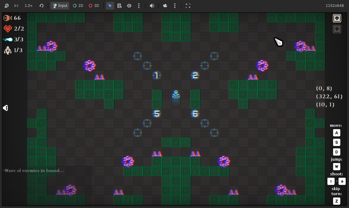 So, turns out platformer physics is tricky, especially when you add the complexity of wrapping the world Asteroids style and modern tropes like wall jumping and dashing. There are various edge cases. What started simple has now become a lot less so. Might have to just remove some of these altogether. Just shows you how much heavy lifting modern game engines do when it comes to physics. We get so used to it.