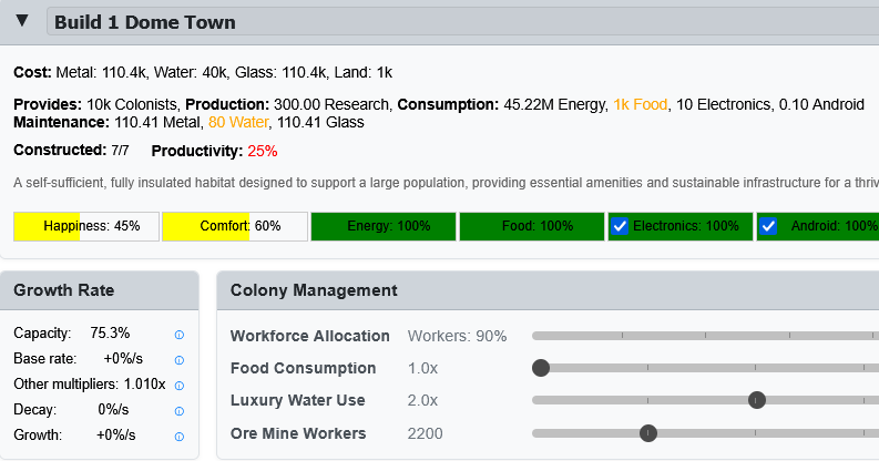 This kind of makes progressing hard, as growth doesn't happen below 50%, but despite full energy (25%) Food (25%), electronics (10%) Androids (10%) comfort (12%) and 6.5% from milestones. This should put me at 88.5% happiness, but instead I'm on 45% somehow? And yes, covering the obvious, I have full resource stockpiles. On a branched save I tested removing energy/food/electronics/etc and found that each moves it by half their expected value (i.e. 5% for electronics).