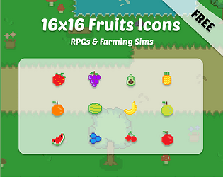 Vibrant 16x16 pixel art fruits icons. Perfect for inventories and crafting in RPGs, Farming Sims, and Survival games.