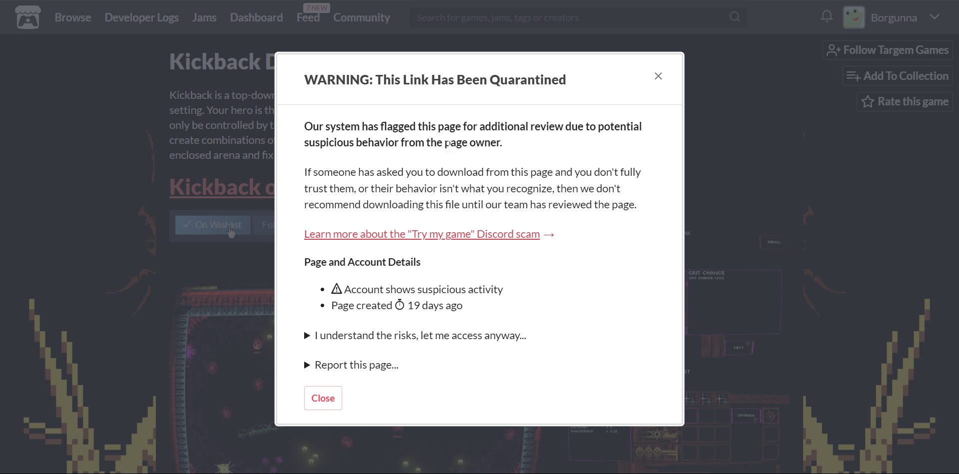 We are the publisher of the game and decided to release a demo version on itch.io. There is also a page of this game from the jam (https://harosh.itch.io/kickback). We read https://itch.io/docs/creators/getting-indexed and https://itch.io/docs/creators/quality-guidelines and didn't see any violations. Promoting a page with quarantine warnings seems pointless, as these warnings greatly affect conversion to link clicks and installing the demo version.