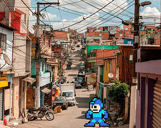Jogo do personagem MegaMan andando pelas ruas do Rio de Janeiro