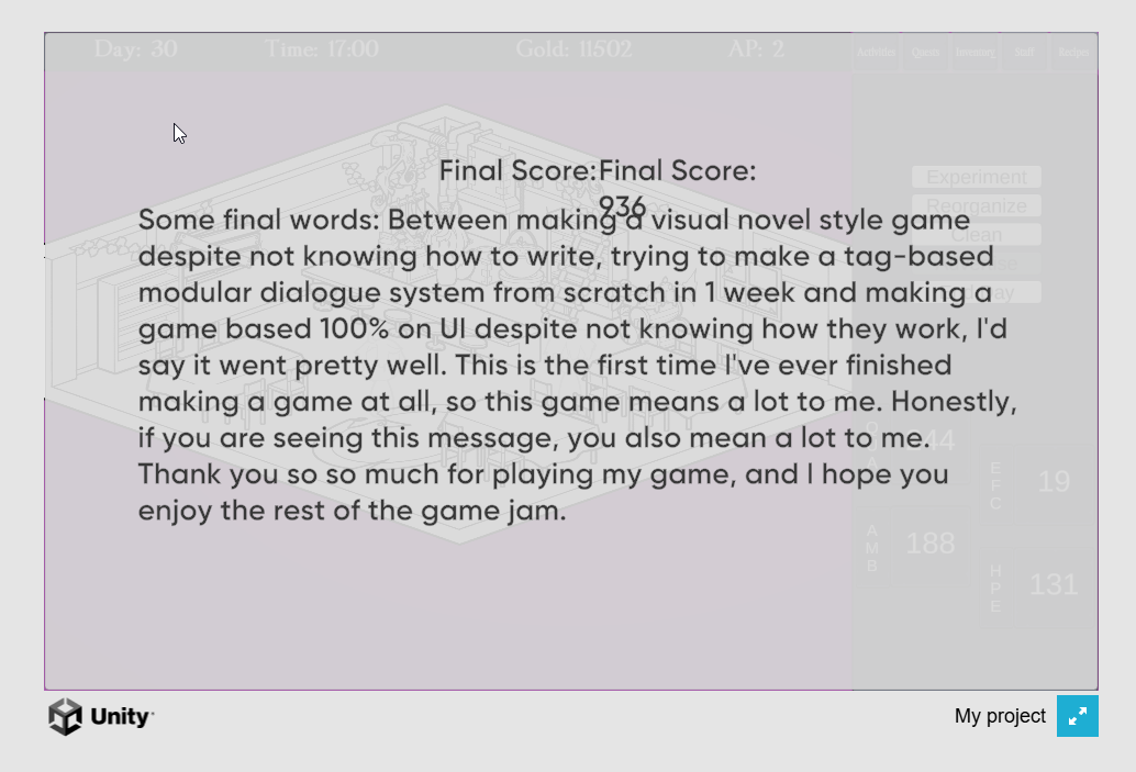 It was a great game — definitely on the longer side — but really enjoyable once I got into it. At first, it was a little hard to tell if it was just a story or an actual game, but once I reached the gameplay sections, it became fun and engaging. I really like the economy mechanics, and I’m impressed by how much you accomplished in just 10 days.