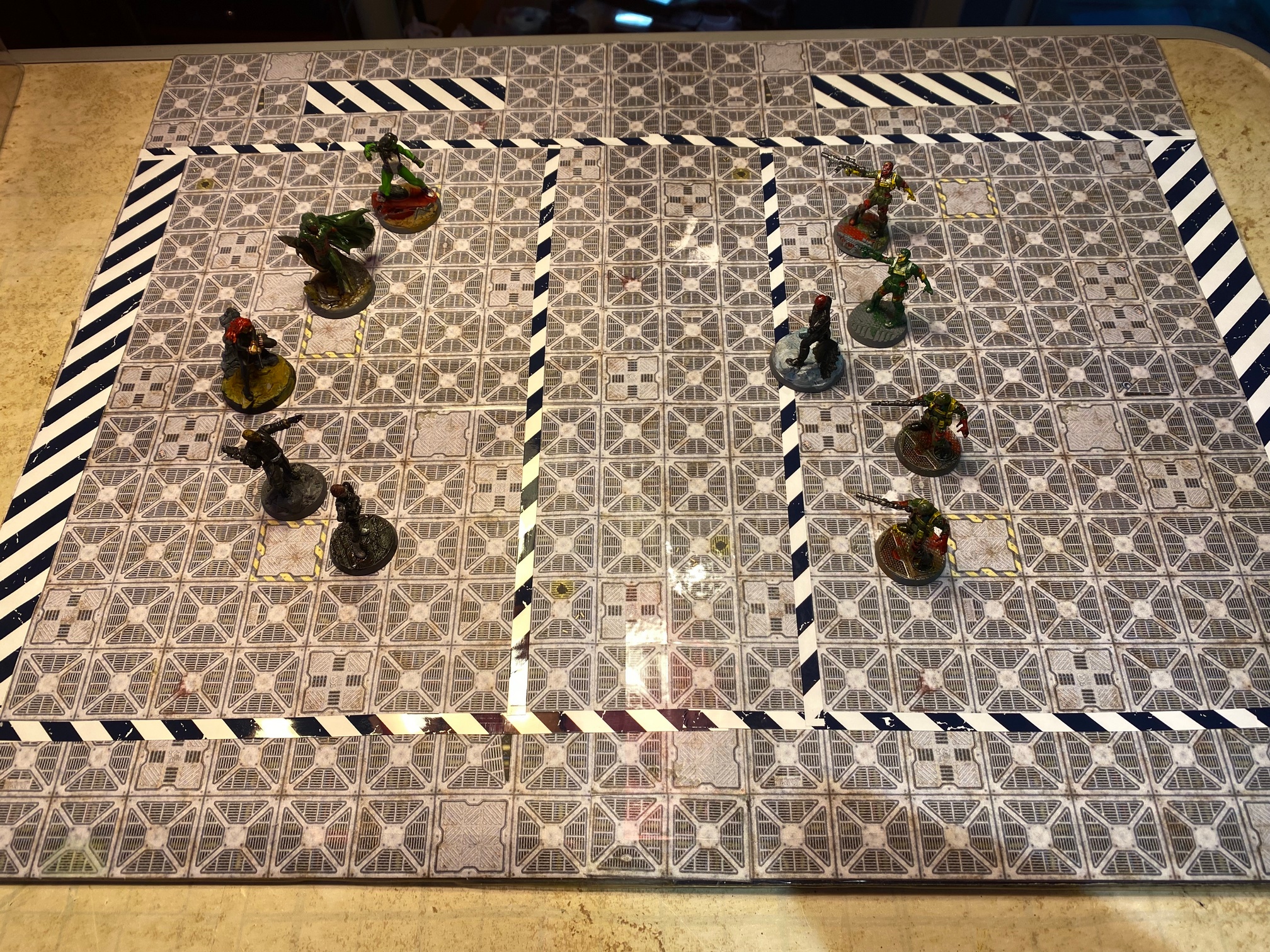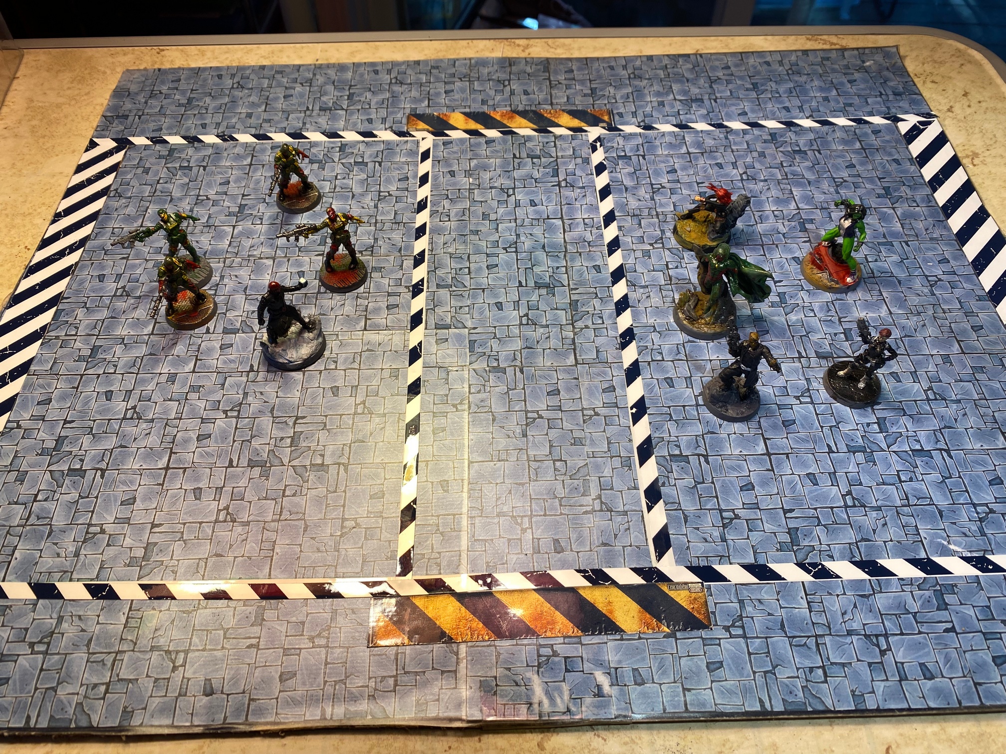 I had an double sided 20x16 game board that I made a while ago but never used. So I repurposed it for MÖRK BOLL! No I have a Sci-Fi steel deck and a Fantasy stone floor. Then stripes are an image that I printed on sticker paper.