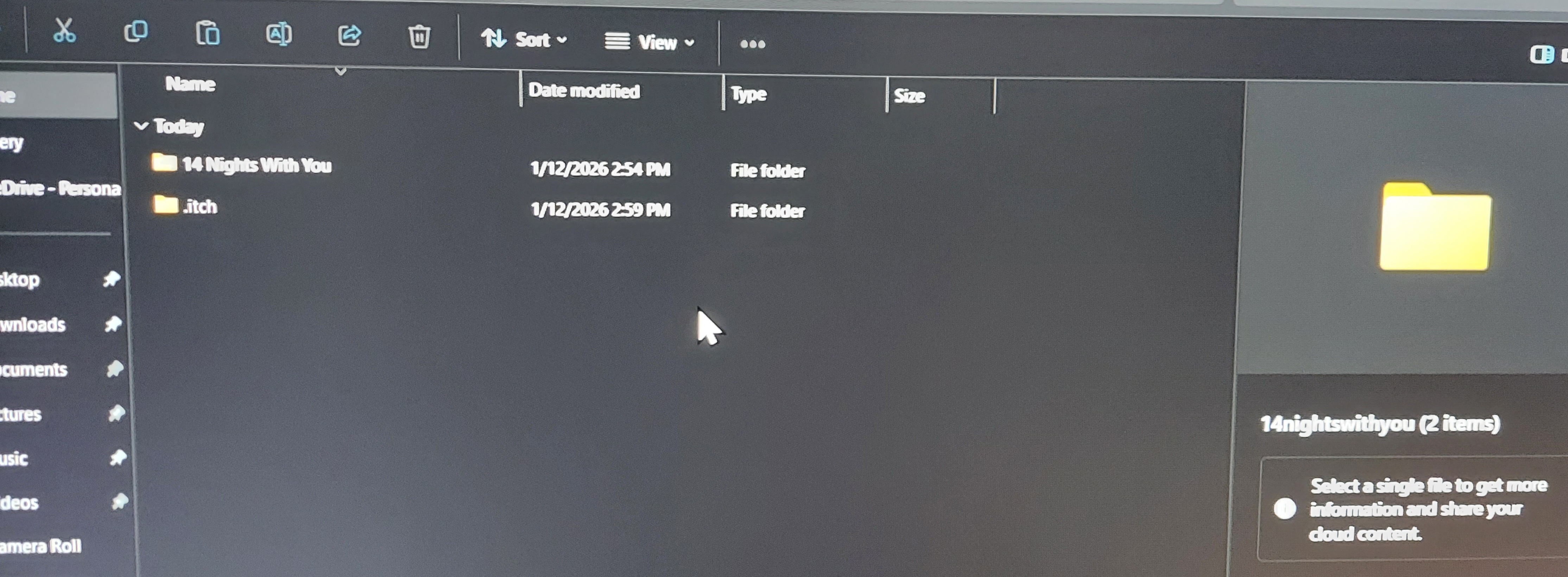when i go in the 14nightswithyou folder, there is two folders, one called itch. and one called 14 Nights With You, but when i put 14 Nights With You in the game folder and click open on the itch app it says the file has been deleted/moved😔🙏 (in the 14 Nights With You folder is a folder called images and two RYPC files called 14nightswithyou and bonus)😭