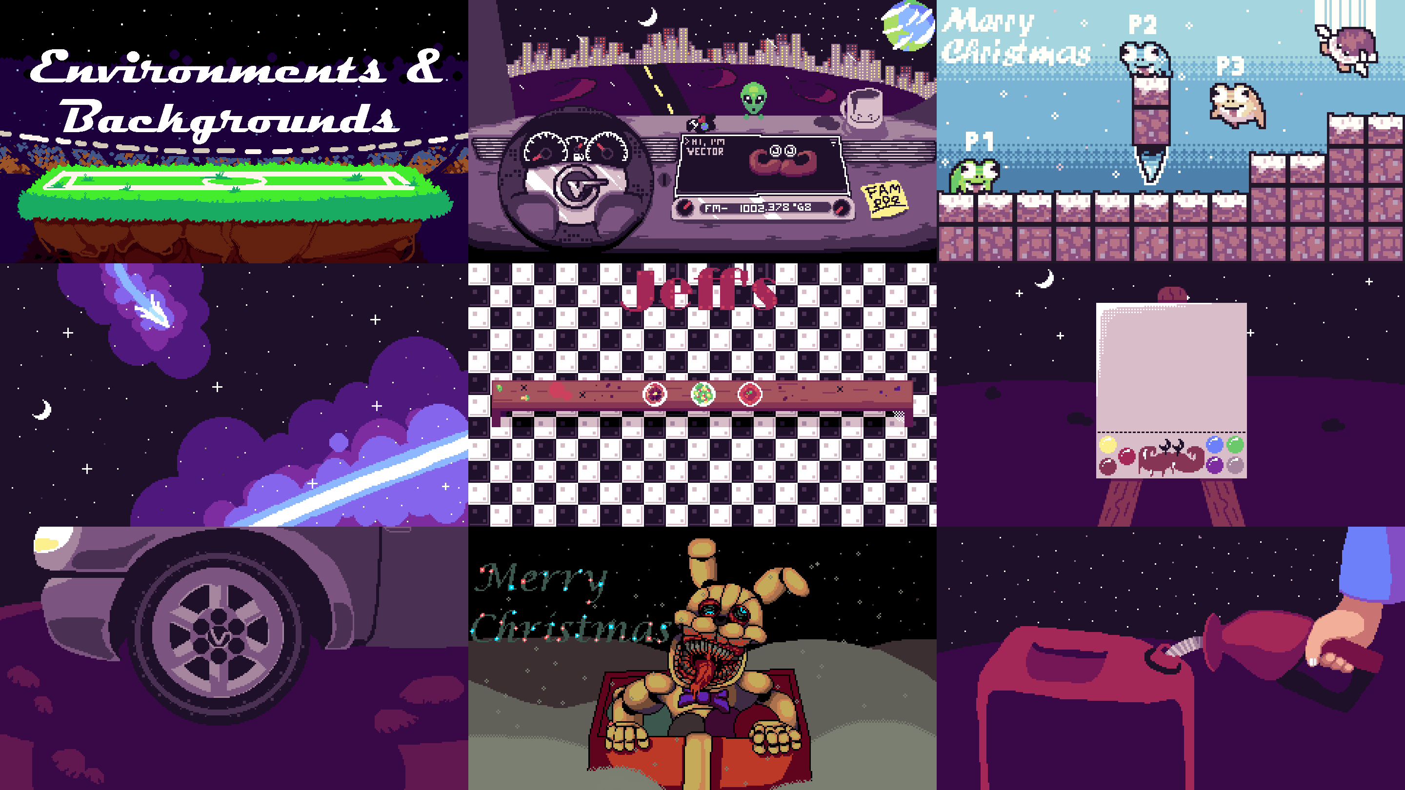 - Environments: I'm able to create backgrounds/Tilesets for your project. highest background was 320x180
