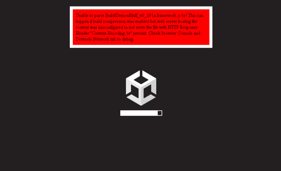 (It says "Unable to parse Build/DemonBluff_v0_391a.framework.js.br! This can happen if build compression was enabled but web server hosting the content was misconfigured to not serve the file with HTTP Response Header "Content-Encoding: br" present. Check browser Console and Devtools Network tab to debug.")