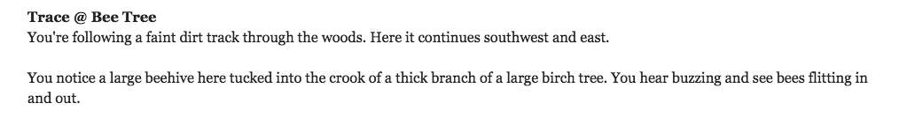 I am at Trace @ Bee Tree but I not able to find any beehive… it is courious because with “help with tree” the answer is “You can’t climb the tree. Maybe stand on something to reach the beehive”…but … Where is the beehive? Am I at the wrong location? Is it necessary to do something to discover the beehive?