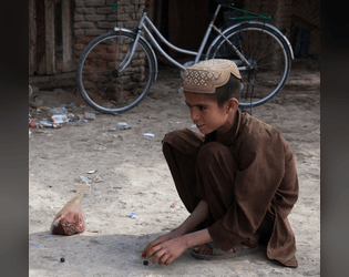 The two grandmothers hurry out from the canopy to check on the kids. A small, round bruise the exact size of a marble is already darkening on the younger girl’s ankle. The older one repeats her plea but the sorti of the moving marble is dismissed outright by the adults. Both children are scolded, the marbles are packed away, and everyone collects their vegetables before leaving in silence.